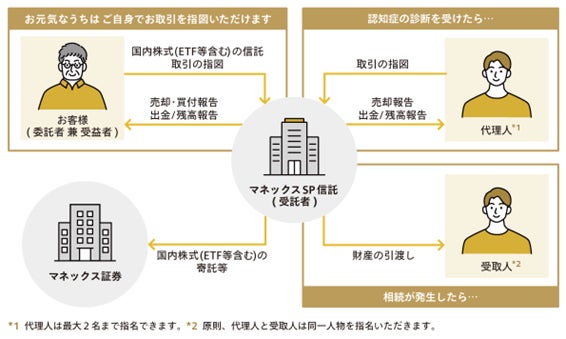 2021年9月に開始した株式管理サービス「たくす株」は、「信託」という仕組みを活用し、お客様が保有する国内上場株式(ETF等含む)を「たくす株専用口座」で預かり、万が一、お客様が認知症になった場合には信託契約に基づいてご家族が売却・出金をできるように設計されたサービスです。