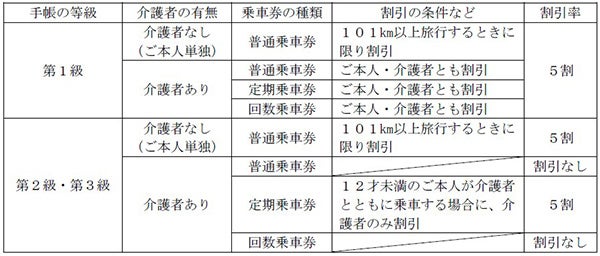 ・ご本人・介護者とも割引を受けることができるのは、同一の種類・乗車区間・有効期間の乗車券を同時にお買い求めいただき、同一の列車に乗車する場合に限ります。
