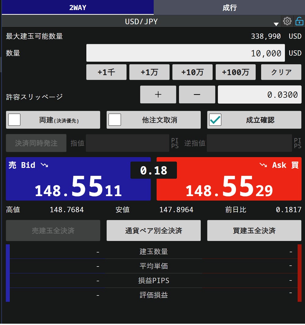 2WAY注文画面もレイアウトを見直し、ボタン配置や情報の整理により操作性を向上させました。さらに、2WAY注文とチャートの通貨ペアが連動するようになり、通貨ペアの切り替えがよりスムーズに行えるようになっております。