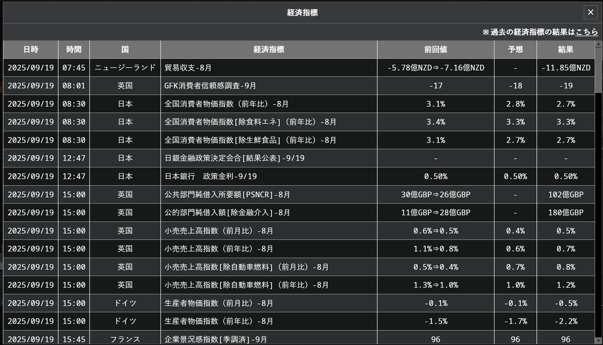 画面左上のバーに表示されている経済指標をクリックすると、モーダルウィンドウが開き、前回値、予想値、結果をまとめて確認できるようになりました。