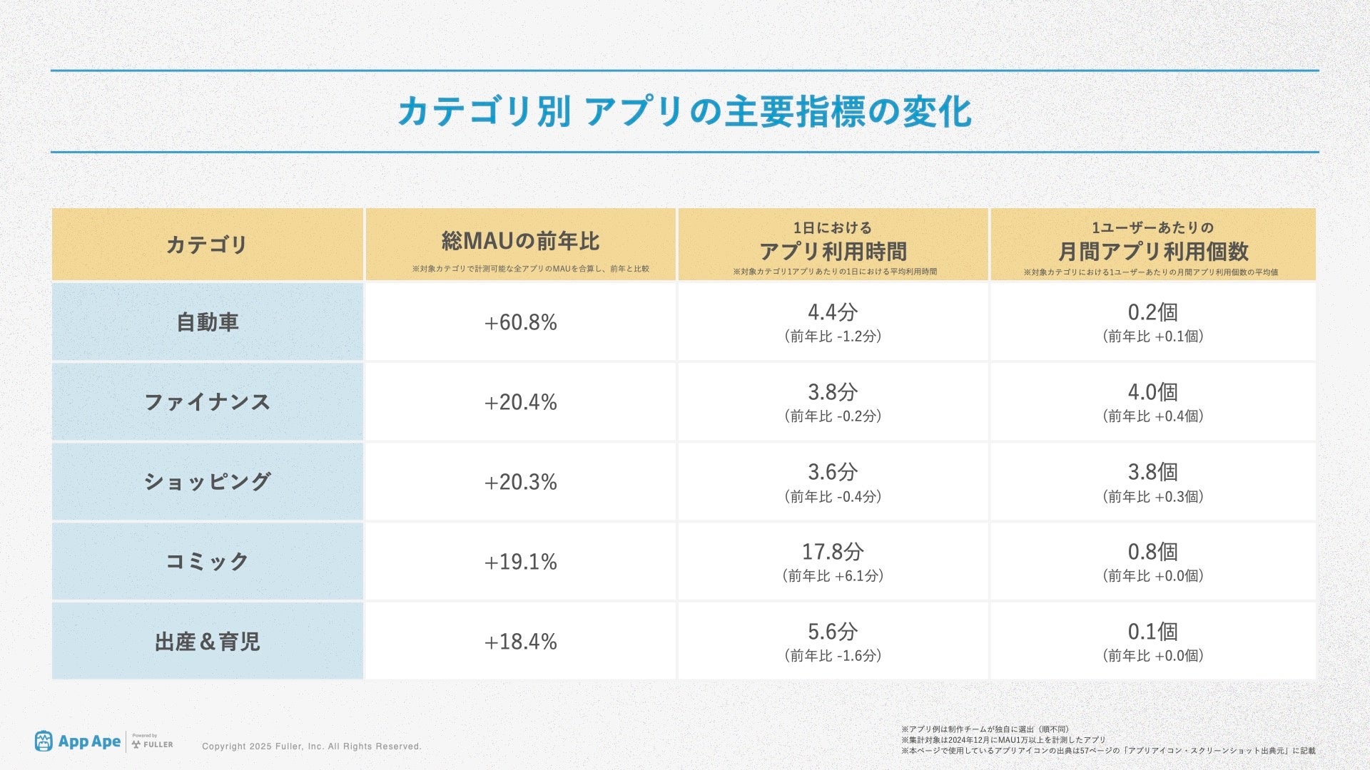 カテゴリ別にアプリ総MAUの増加率が高いカテゴリを見ると、「自動車」の成長が特に顕著でした。対象カテゴリ1アプリあたりの1日における平均利用時間を見ると、「コミック」は前年比+6.1分と大幅に増加しました。