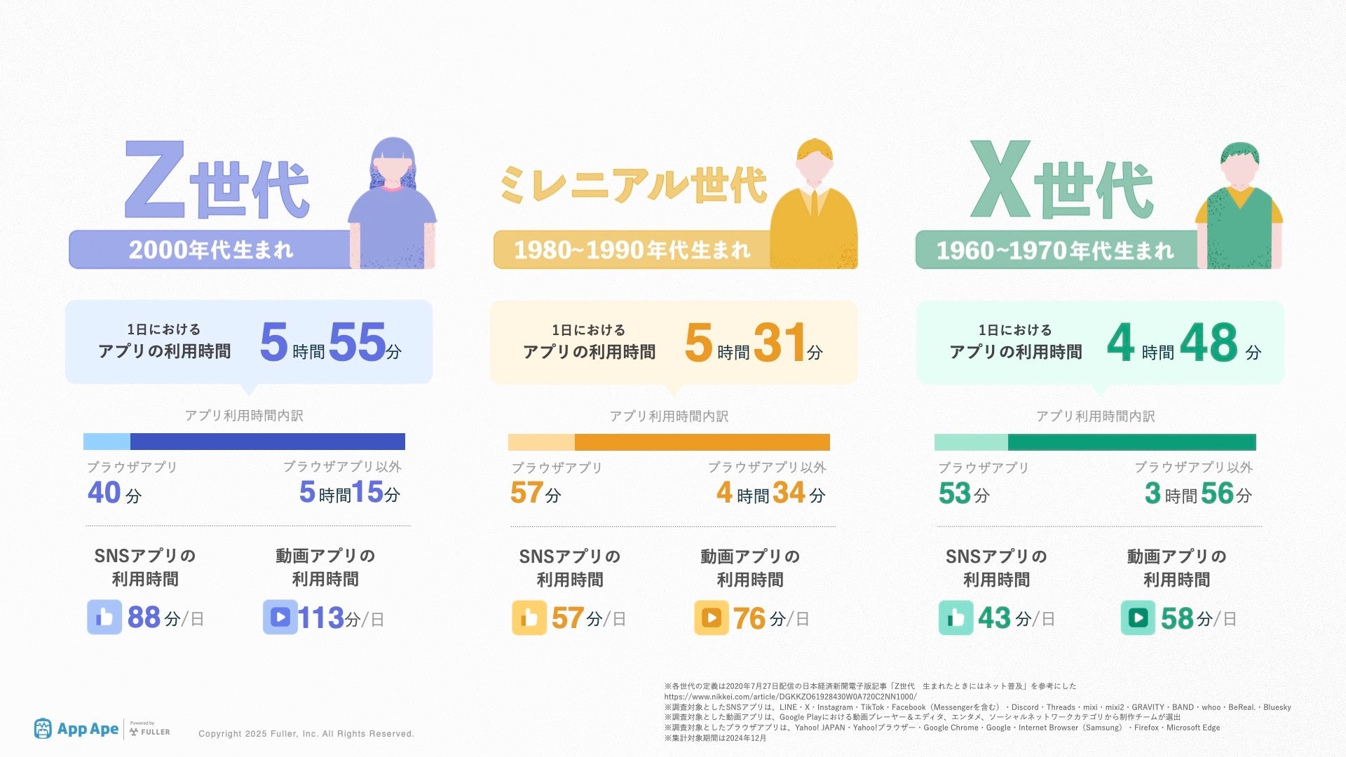 アプリユーザーを「Z世代(2000年代生まれ)・ミレニアル世代(1980年〜90年代生まれ)・X世代(1960年〜1970年代生まれ)」の3世代に区分。1日におけるアプリの利用時間・SNSアプリの利用時間・動画アプリの利用時間の3つの指標について取りまとめ、世代間の差異を比較しました。