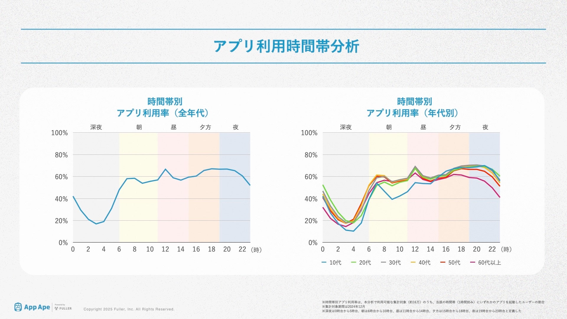 時間帯別アプリ利用率(全年代)を見ると、朝の時間帯から利用が増加し、12時台にかけて一時的なピークを迎えた後、夕方から夜にかけて高い利用率を維持する傾向がありました。