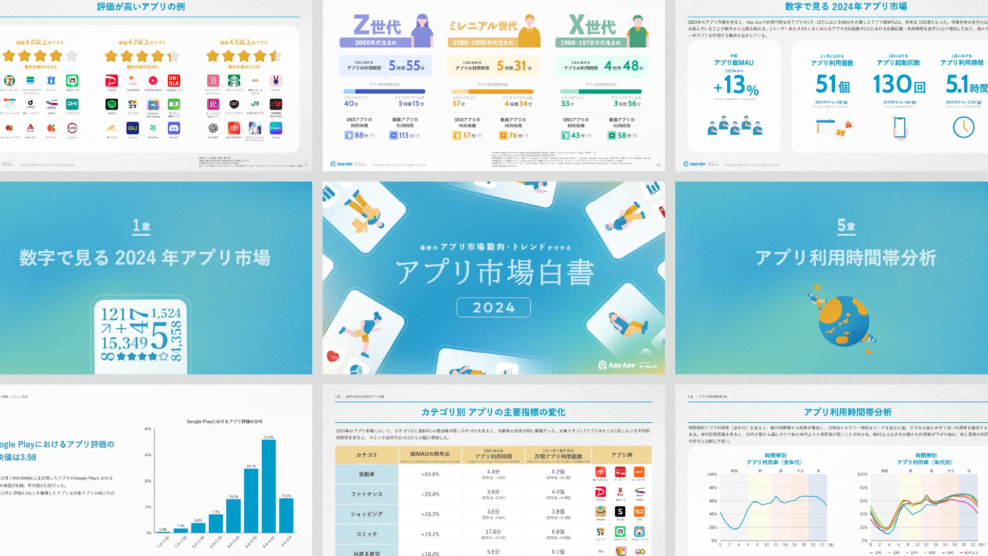 2024年のアプリ市場動向を振り返るとともに、アプリストアにおける評価やアプリユーザー数、Z世代やミレニアル世代といった世代ごとのアプリ利用時間など、さまざまな視点でアプリデータを分析。アプリを取り巻くユーザーの“いまの姿”を浮き彫りにしました。