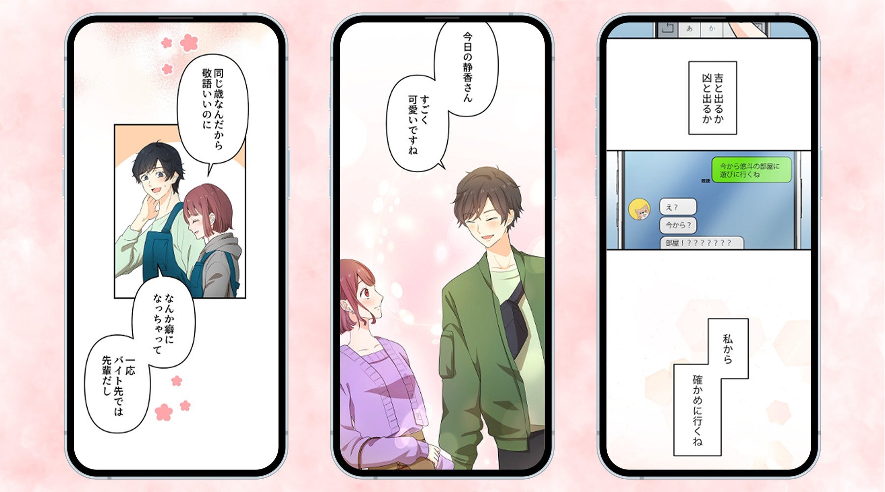 投稿された小説の中でも人気のエピソードを"とある溺愛のカタチ"としてwebtoon化。各エピソードは男女それぞれの視点から描かれた前編と後編の2話で構成されており、エピソードごとに異なる作家が描く溺愛ストーリーを楽しむことができます。12月25日(日)からは、ありめ蛍氏の『オタクの君は気づいてない』前編・後編の配信を開始。そのほかの作家のエピソードも順次配信いたします。