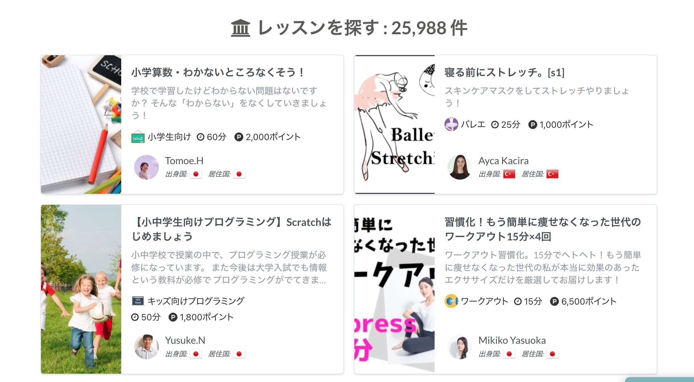 語学のみならず、音楽、フィットネス、ダンス、自分磨き、家庭教師レッスンなど豊富なバラエティあるカテゴリーのオンラインレッスンが揃っています。