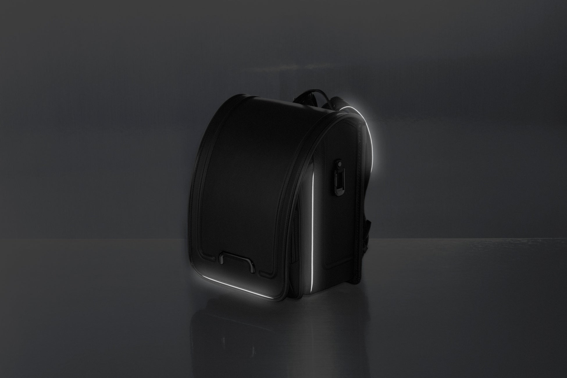 本体は防水素材(ポリエステル製は撥水)、360°の反射材つき。小さなお子さまにも使いやすいよう、左右側面のカラビナと、自動ロック錠前を採用しました。
