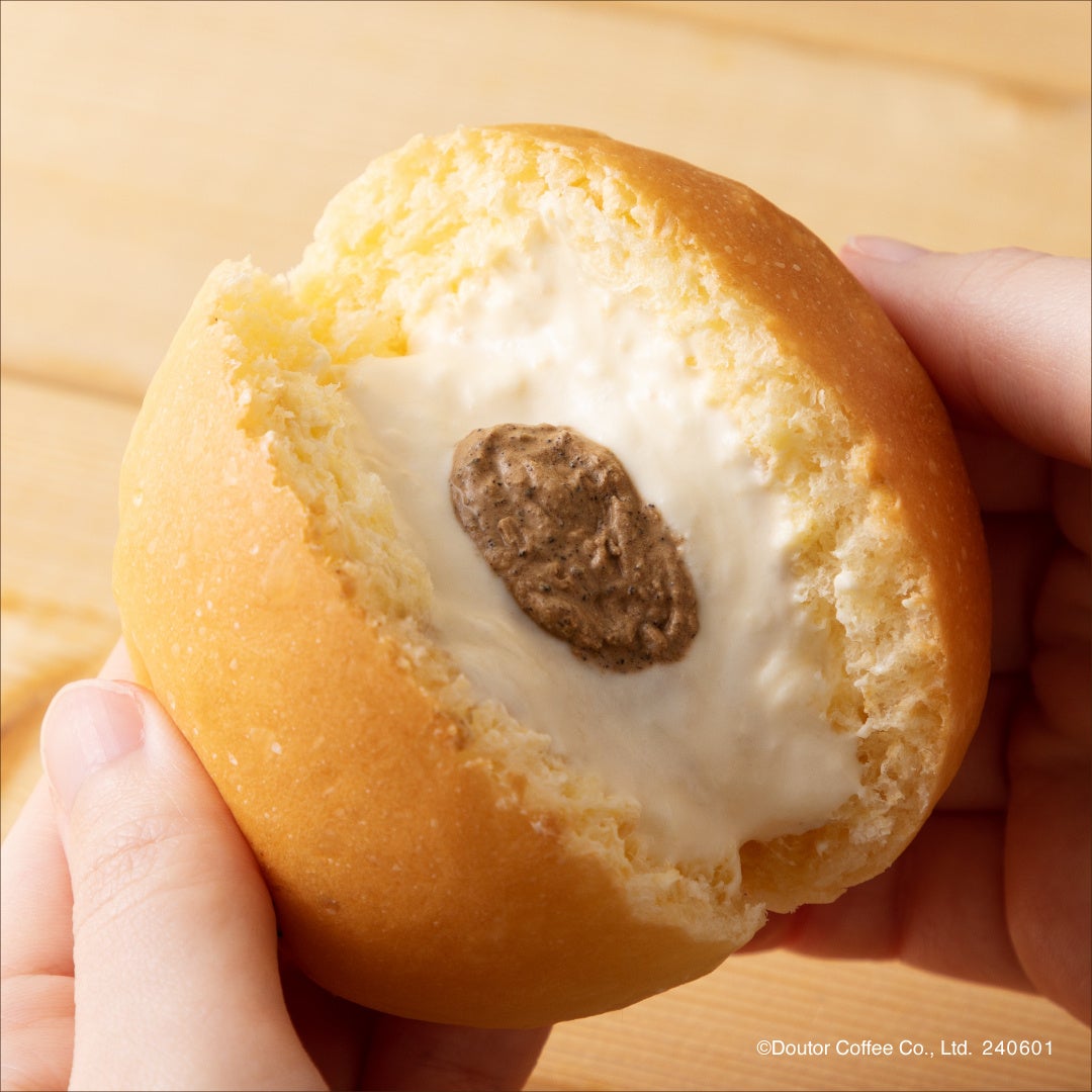 八天堂×ドトールのコラボ商品第2弾。ふんわり柔らかな生地の中に、やさしいくちどけの八天堂特製カスタードクリームと、ほろ苦いコーヒーホイップクリームを2層仕立てで入れました。ほどよい甘さのカスタードクリームがコーヒーの苦味とコクを引き立たせ、さらに、コーヒーホイップクリームに混ぜ込んだ、細かく挽かれたコーヒー粉がアクセントになって、濃厚なカフェオレのような味わいをお楽しみいただけるくりーむパンになりました。