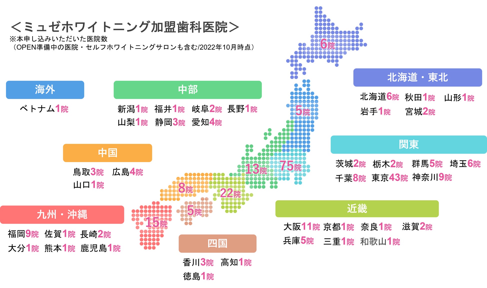 そこで、2017年10月よりホワイトニング専門医院で培ったノウハウと、ミュゼプラチナムの集患支援やブランド活用をパッケージ化した「ミュゼホワイトニングパートナープログラム」の提供を開始。この度、多くの歯科医院さまにご支持いただき、2022年10月に加盟医院数が150院(※4)に到達いたしました。