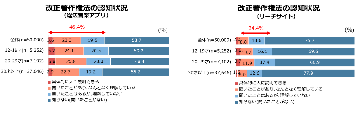 2020年10月に施行された改正著作権法に関する認知状況では、違法音楽アプリの規制を強化する改正法については施行1年以上が経過した2021年11月調査でも前回調査とほぼ横ばい(46.4%)を維持した。リーチサイトの規制強化を目的とした改正著作権法に関する認知状況は24.4%と違法音楽アプリを下回る結果となった。