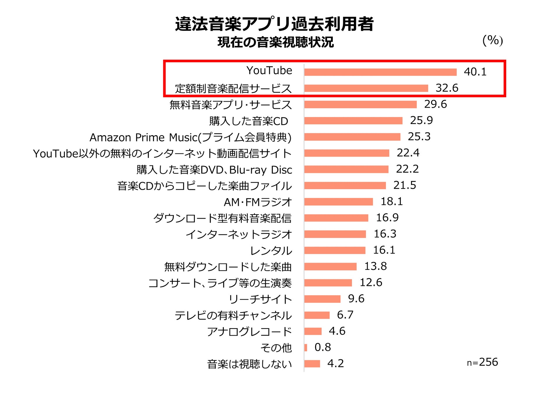 - 違法音楽アプリ・リーチサイト過去利用者の現在の音楽視聴方法として、いずれも定額制音楽配信サービスが上位に