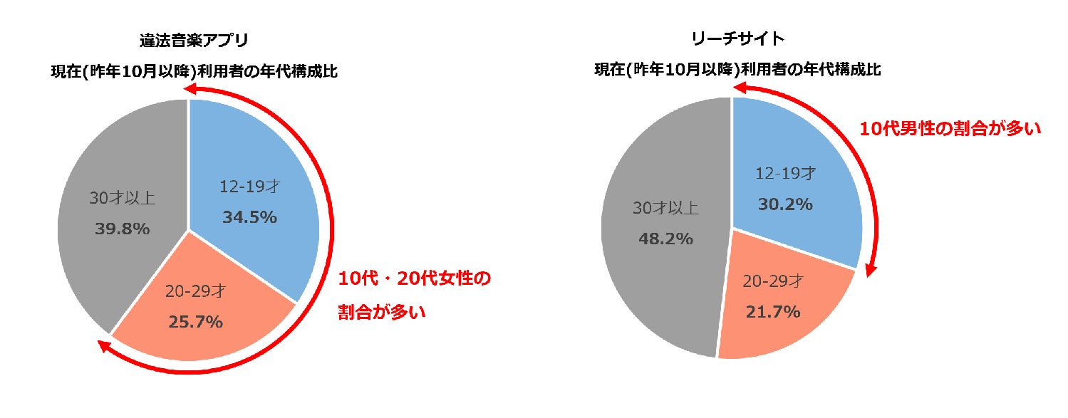 利用者の年代別構成では、違法音楽アプリ、リーチサイト何れも30才以上が最も高く、次いで12-19才、20代が最も低い結果となった。このうち性年代別でみると、違法音楽アプリは10代・20代女性、リーチサイトは10代男性の割合が突出して多いことがわかった。