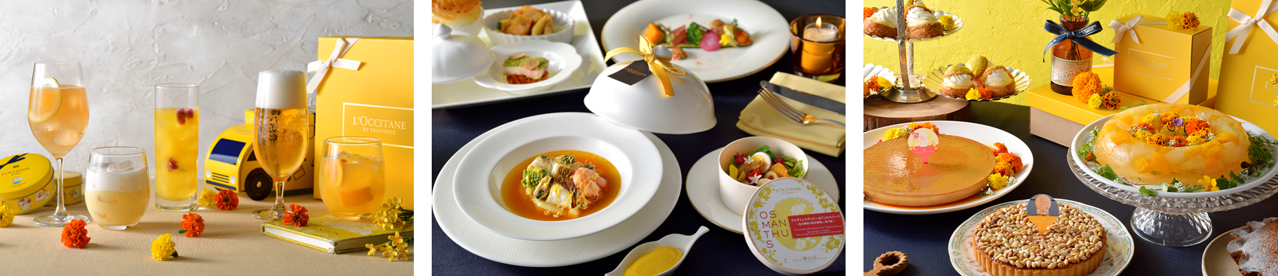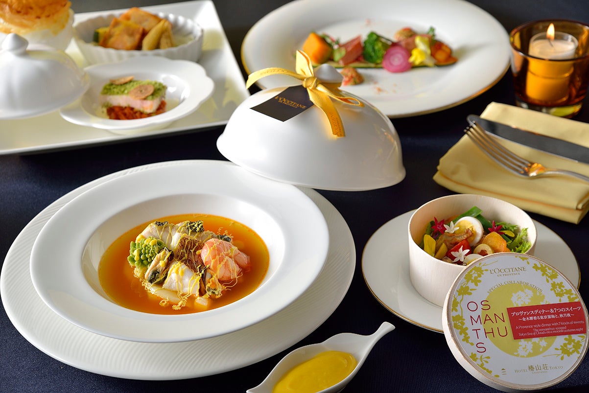 まずは、金木犀(オスマンサス)の可憐な色と香りを漂わせた「香る、東京雲海」の演出をテラスから眺めながらウエルカムドリンクで乾杯。乾杯後は、屋内会場にて、オーセンティックな南仏料理にロクシタンのエスプリをまとわせたフレンチのフルコースをご堪能ください。