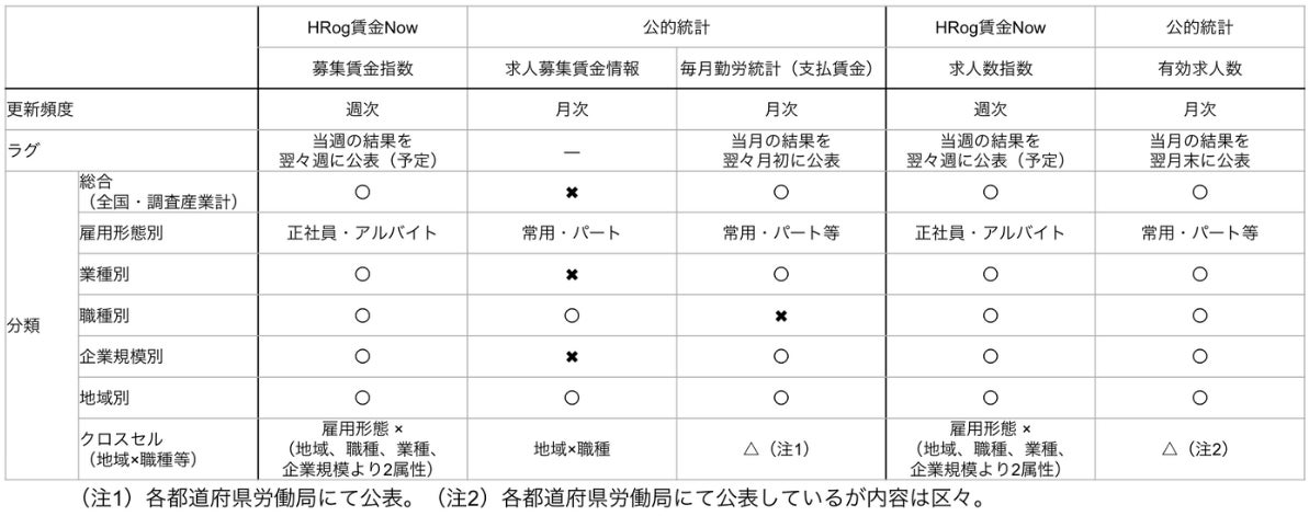 「HRog賃金Now」は、労働市場に関する各種公的統計と比較して高い頻度性と速報性を持ち、「地域×職種」のクロスセル分析が容易な賃金動向指数サービスです。公的統計と「HRog 賃金Now」 とを合わせて見ることで公的統計の数値を相対化し、解釈にさらなる深みをもたらすことができます。求人広告データの取得日から2週間後という高い速報性で指数を提供しており、指数は週次で更新され、水準値や前年同期比でもご覧いただけます。