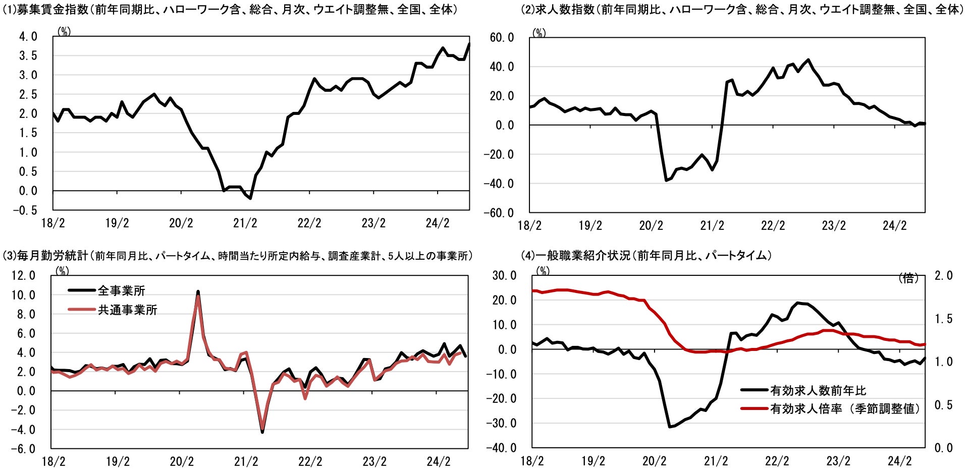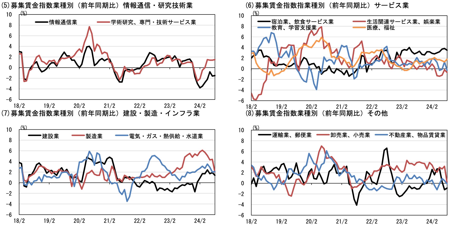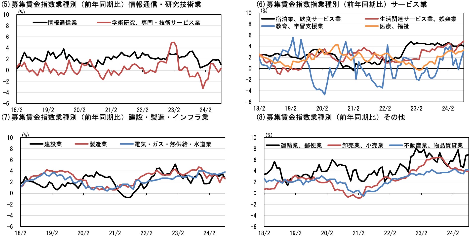 一方で、募集賃金も低位に推移している「生活関連サービス業、娯楽業」では減速が目立っており、これらの業種では求人需給がひっ迫していない様子がうかがえる。
