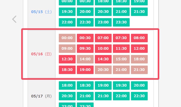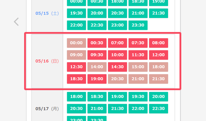 2. 「講師スケジュール」に表示されている「赤いボタン」の時間から、お好みの時間を選んで予約