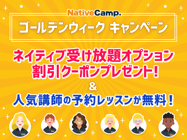 【英会話レッスン回数無制限】ネイティブキャンプ ゴールデンウィークキャンペーン開催!ネイティブ受け放題オプション 割引クーポンプレゼント&毎日開催!人気講師の予約レッスンが無料!