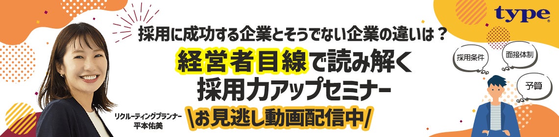 ひとつ上を目指す人のキャリア転職サイト『type』、正社員で長く働きたい女性のための転職サイト『女の転職type』は、中途採用担当者様向けのオンラインセミナーを定期開催しております(https://info.type.jp/webinar_guide)。