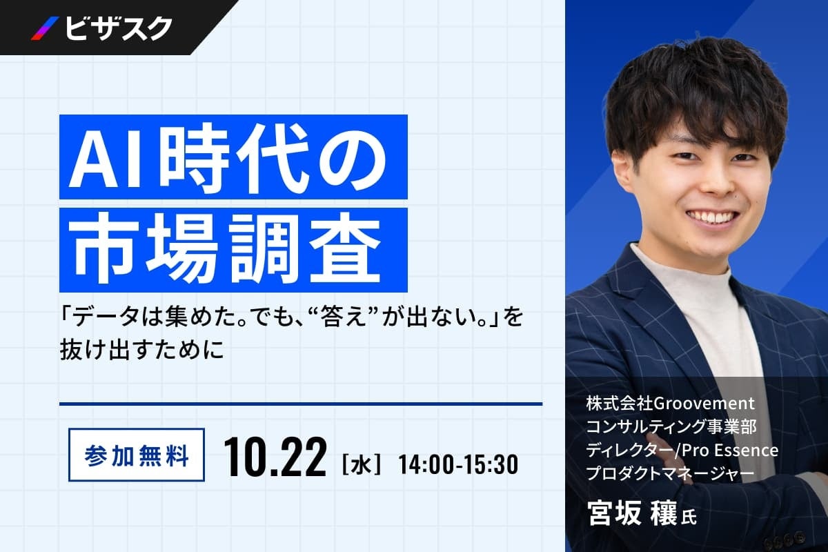 「知見と、挑戦をつなぐ」をミッションにグローバルなナレッジプラットフォームを運営する株式会社ビザスク(以下、当社)は、『AI 時代の市場調査』をテーマに、株式会社Groovement コンサルティング事業部 ディレクター/Pro Essence プロダクトマネージャー 宮坂 穰氏 ご登壇による無料オンラインセミナーを 10/22 (水) 14:00 より開催します。