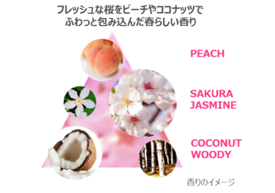 ●フレッシュな桜の香りを、ふんわり甘いピーチやココナッツの香りが包み込み、春らしい香りと淡い桜色のパウダーが洗顔タイムを彩ります。