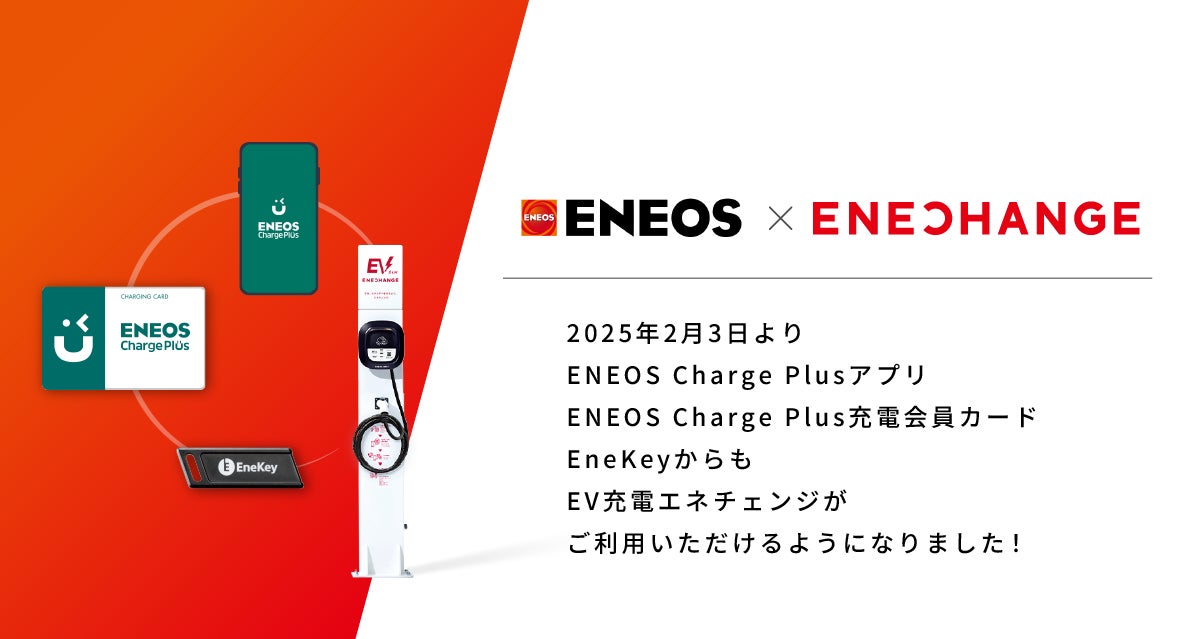 ENECHANGE(エネチェンジ)株式会社(本社:東京都中央区、代表取締役CEO:丸岡 智也、以下 エネチェンジ)は、ENEOS株式会社(本社:東京都千代田区、代表取締役社長 社長執行役員:山口 敦治、以下 ENEOS)とEV・PHEVユーザーの利便性向上のため、EV充電のローミング連携することをお知らせします。2025年2月3日(月)より、ENEOSが提供するENEOS Charge PlusのEV充電決済サービス「ENEOS Charge Plusアプリ」、「ENEOS Charge Plus充電会員カード」、「EneKey(モバイルEneKeyを除く)」からも、「EV充電エネチェンジ」の全国の対象充電器をご活用いただけるようになります。