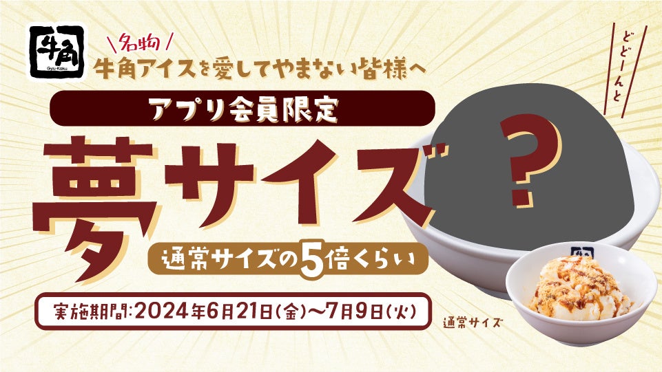 コロワイドグループの株式会社レインズインターナショナルは、2024年6月21 日(金)より、牛角アイスが5倍サイズで楽しめる「牛角アイス夢サイズ」を牛角アプリ会員限定で販売します。