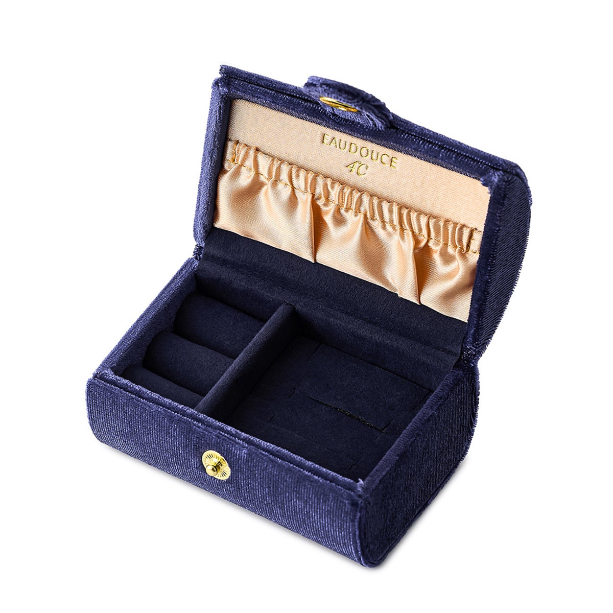 新しい一年の始まりにふさわしく、深みのあるアイオライトブルーが印象的なジュエリーボックス。外装はベルベットのような柔らかさで、大切なものを包み込むような上質感を演出しています。内側にはサーモンゴールドのサテン生地があしらわれ、開けた瞬間に華やかさが広がります。蓋の内側には「EAUDOUCE 4°C」のロゴが刻まれ、ブランドのぬくもりと想いを静かに伝えます。一年の門出を祝うコレクションを、この特別なケースに収めて贈ります。