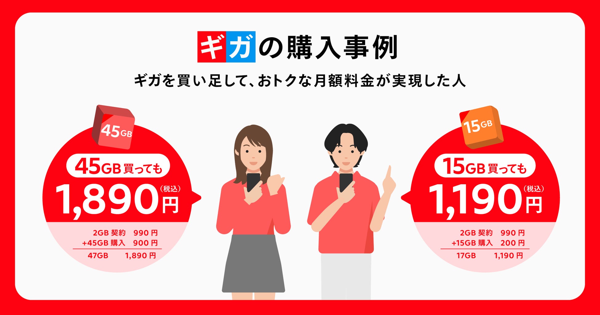 ギガの購入により、47GBで1,890円や17GBで1,190円といった大容量プランを安価に実現した事例が登場しています。ギガを割安で購入することにより、月額990円(2GB/税込)の契約者でもおトクに大容量のデータ通信が実現できていることが伺えます。