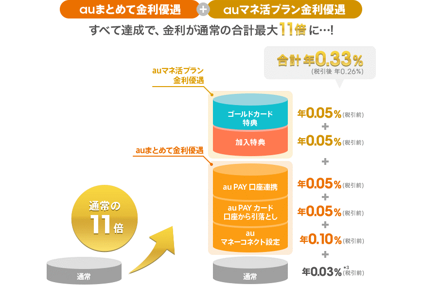 「auまとめて金利優遇」に加えて、新たに提供を開始した「auマネ活プラン金利優遇」の条件をすべて達成すると、円普通預金金利が合計最大で年0.33%(税引後 年0.26%)となります。