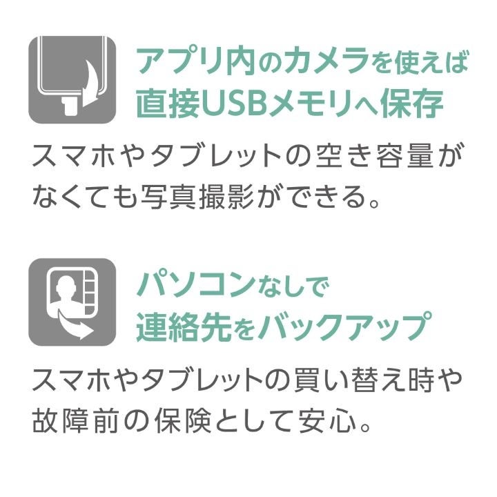 アプリ内のカメラ機能を使用することで、直接USBメモリーに写真を保存できます。