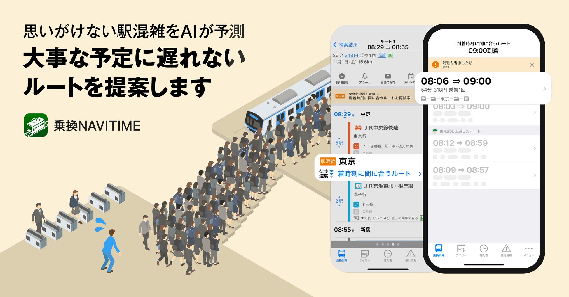『乗換NAVITIME』AIによる駅混雑予測で思いがけない乗換の遅れを先読み、推奨出発時刻や代替ルートを提案する新機能を提供開始