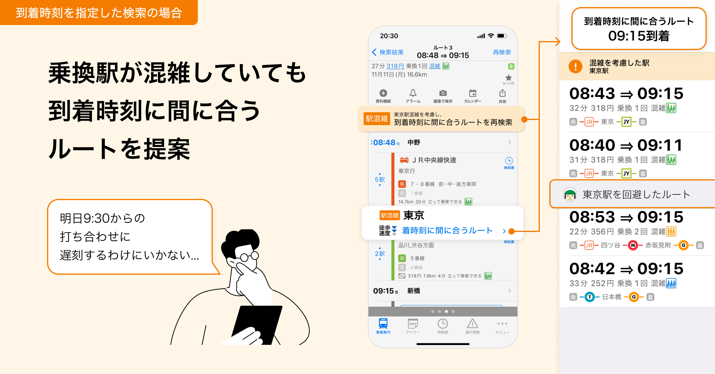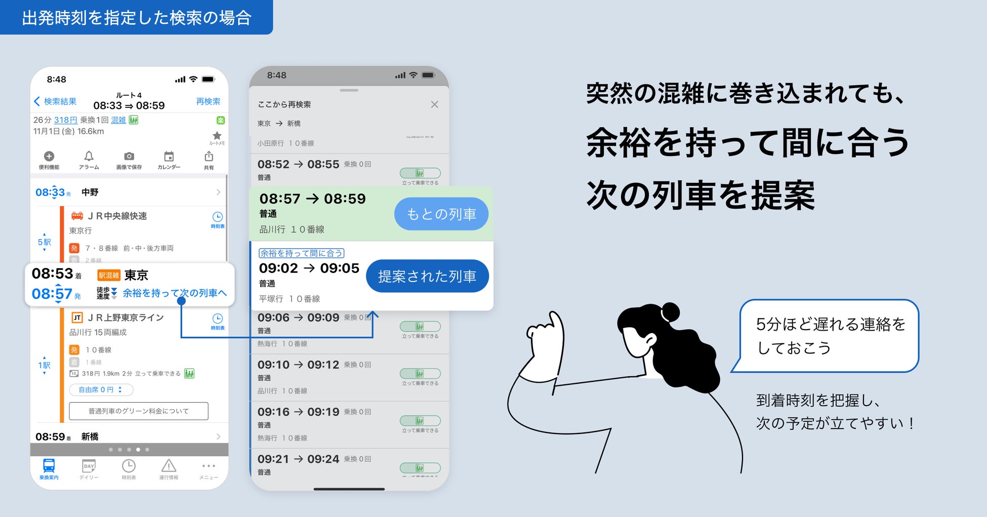 本機能による注意喚起にて、外出前や移動中に到着時間に遅れる可能性があることを知り、出発時間をどのぐらい早めれば到着予定時刻に間に合うか、遅れた場合何時に到着できるか、乗換駅の混雑を避ける代替ルートはあるのか、といった情報を確認できるようになります。
