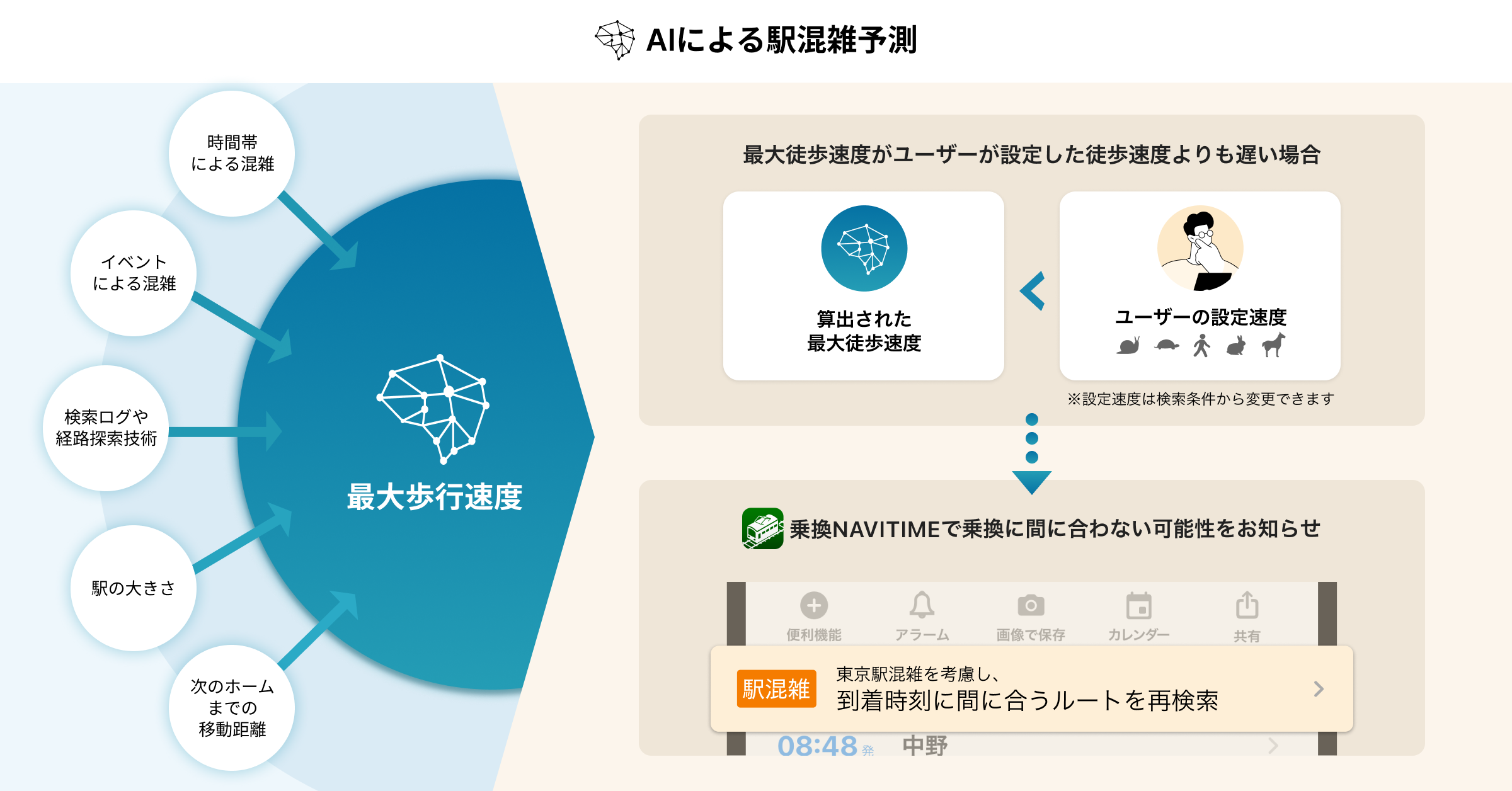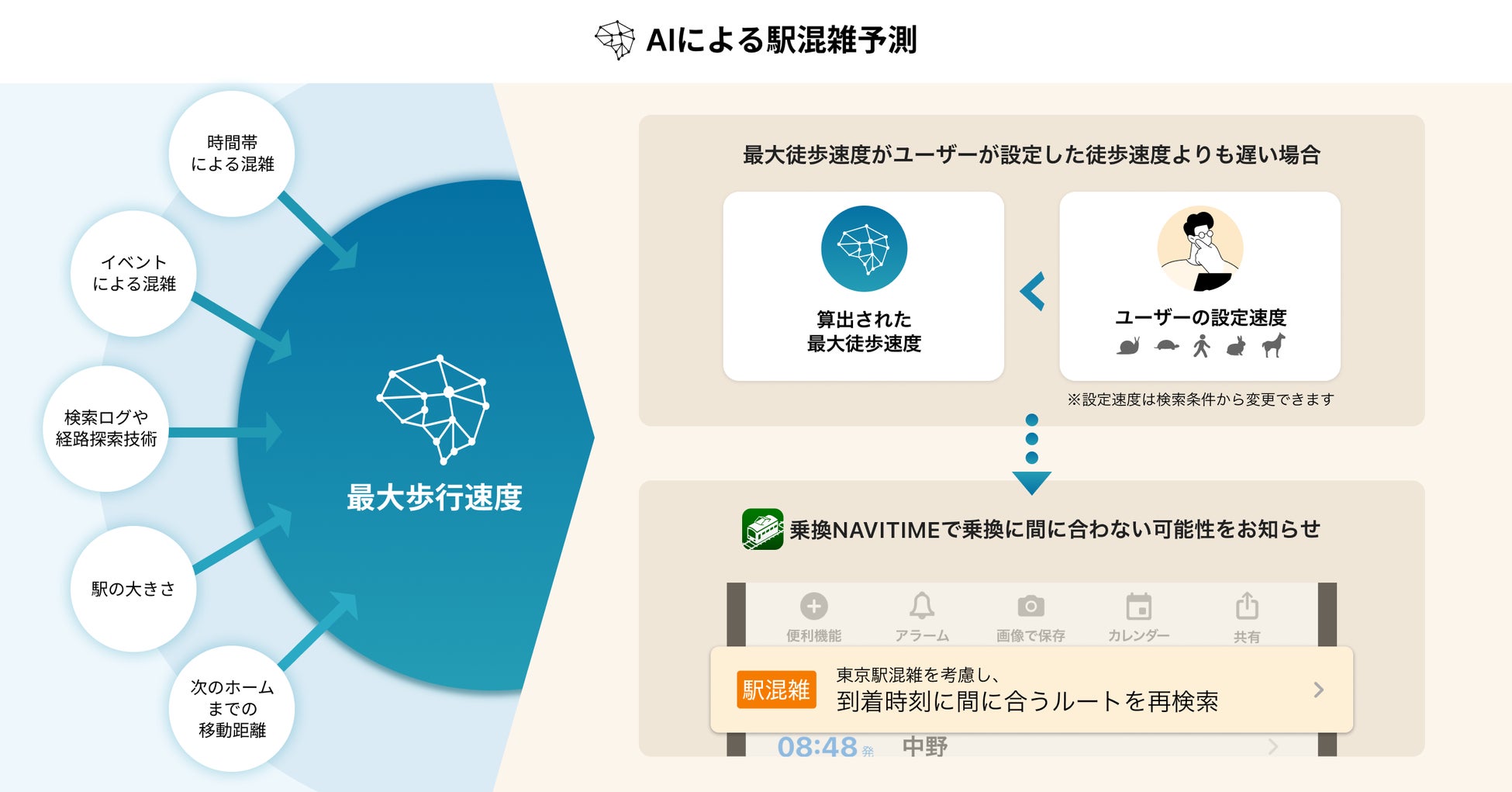 ナビタイムジャパンが蓄積する検索ログや経路探索技術を用いて、時系列解析のAIモデルが駅の混雑具合を予測し、駅構内を歩くことができる速さ(最大歩行速度)を算出します。最大歩行速度と、ユーザーがアプリ上で設定する歩行速度を比較し、次に乗車する電車のホームまでの移動距離や時間帯、イベントなど突発的な要因による混雑、駅の大きさ(許容量)等を考慮します。通常の乗換時間では間に合わない場合、到着時刻を設定してルート検索した時は、推奨出発時間や混雑する乗換駅を回避する代替ルートを提示し、出発時刻を指定した時は、余裕を持って乗換できる次の列車を提案し、到着予定時刻をご確認いただけます。またルート詳細画面にて、最大歩行速度に応じて3段階で矢印を表示し、矢印が多いほど混雑で歩くスピードがゆっくりになりますので、乗換時の参考になればと思います。