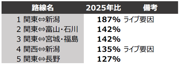 〇路線別では、関東⇔新潟(前年同期比187%)、関東⇔宮城・福島(同142%)、関東⇔富山・石川(同142%)などの中距離路線が好調