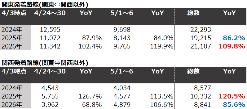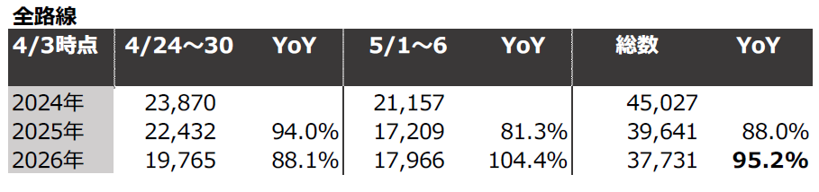 ■【日並びの偏り】連休後半(5月2日~6日)に予約集中、最大で前年同期比約1.9倍に
