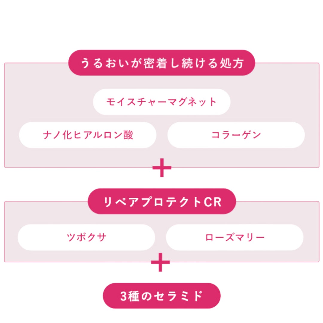 さらに、モイスチャーマグネットHC、リペアプロテクトCR、3種のセラミドなど美容液成分贅沢配合。