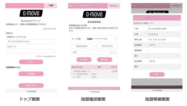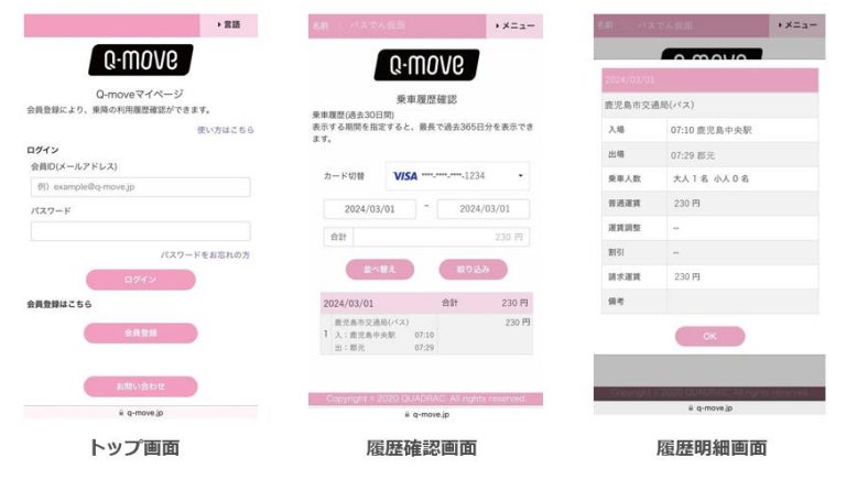 交通事業者向け決済及び認証のプラットフォームを提供する QUADRAC の Q-move サイト( https://q-move.info/ )にアクセスいただき、「マイページ」の会員登録手続きの後ご確認いただけます。