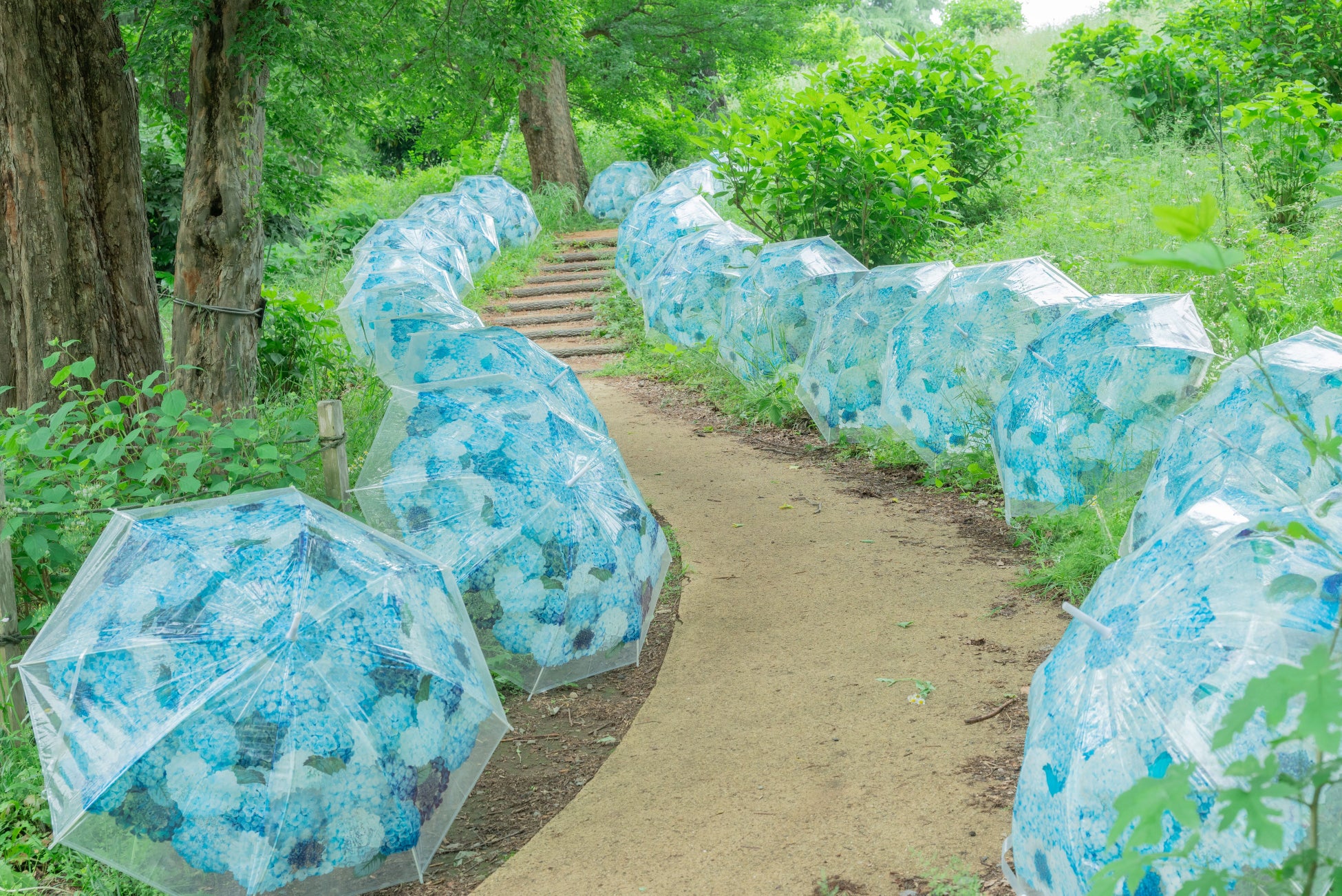 園内の各ゲートにて「アジサイ傘」の貸し出しを行います。アジサイと一緒に写真を撮るときはもちろん、急な雨に困ったときや、晴れた日にもご利用いただけます。