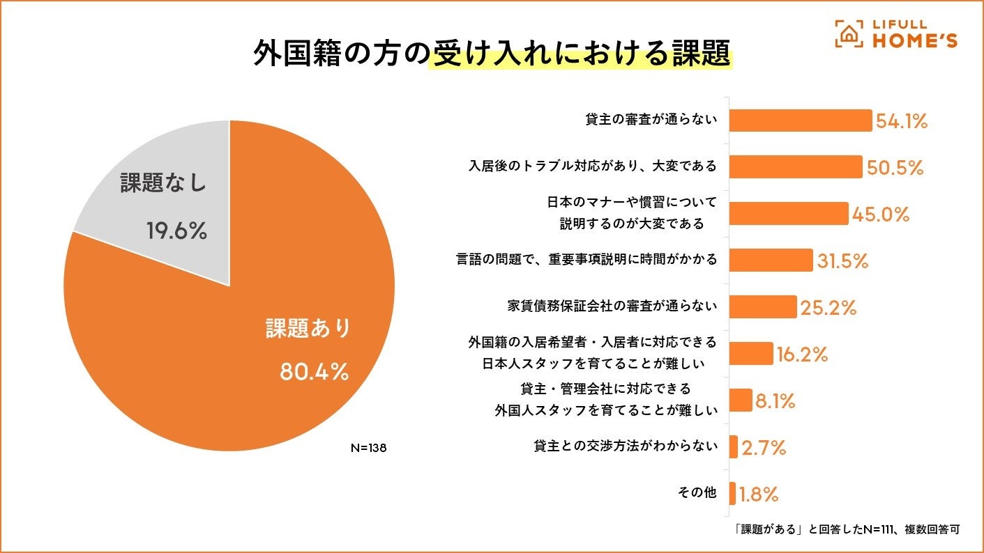 また、「入居後のトラブル対応があり、大変である」(50.5%)「日本のマナーや慣習について説明するのが大変である」(45.0%)が言語の問題よりも上位にランクインしました。