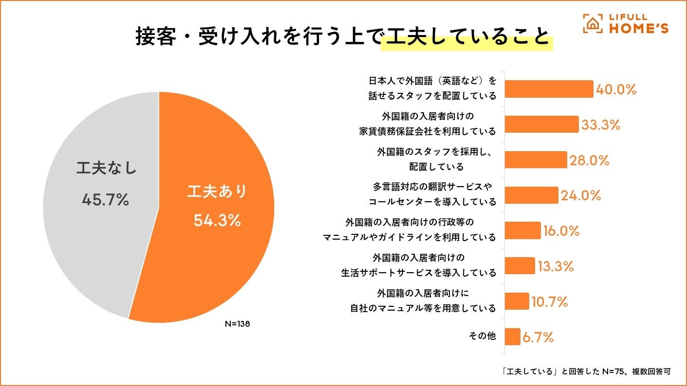 接客・受け入れを行う上で工夫をしている不動産店舗は54.3%。その中でも多かった回答が「日本人で外国語(英語など)を話せるスタッフを配置している」(40.0%)、「外国籍の入居者向けの家賃債務保証会社を利用している」(33.3%)でした。この結果からも外国籍の方の接客・受け入れを行う上で課題となるのが、言語の壁と家賃滞納トラブルの事前回避であることがうかがえます。