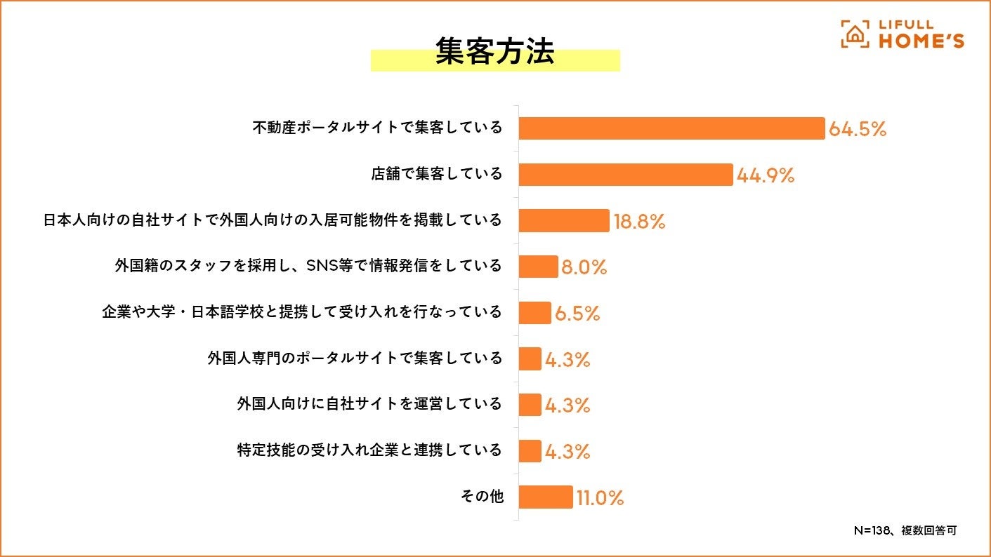 集客方法: 6割がポータルサイトを利用。外国人向けサイトの運営や特定技能の受け入れ企業と連携している不動産店舗も