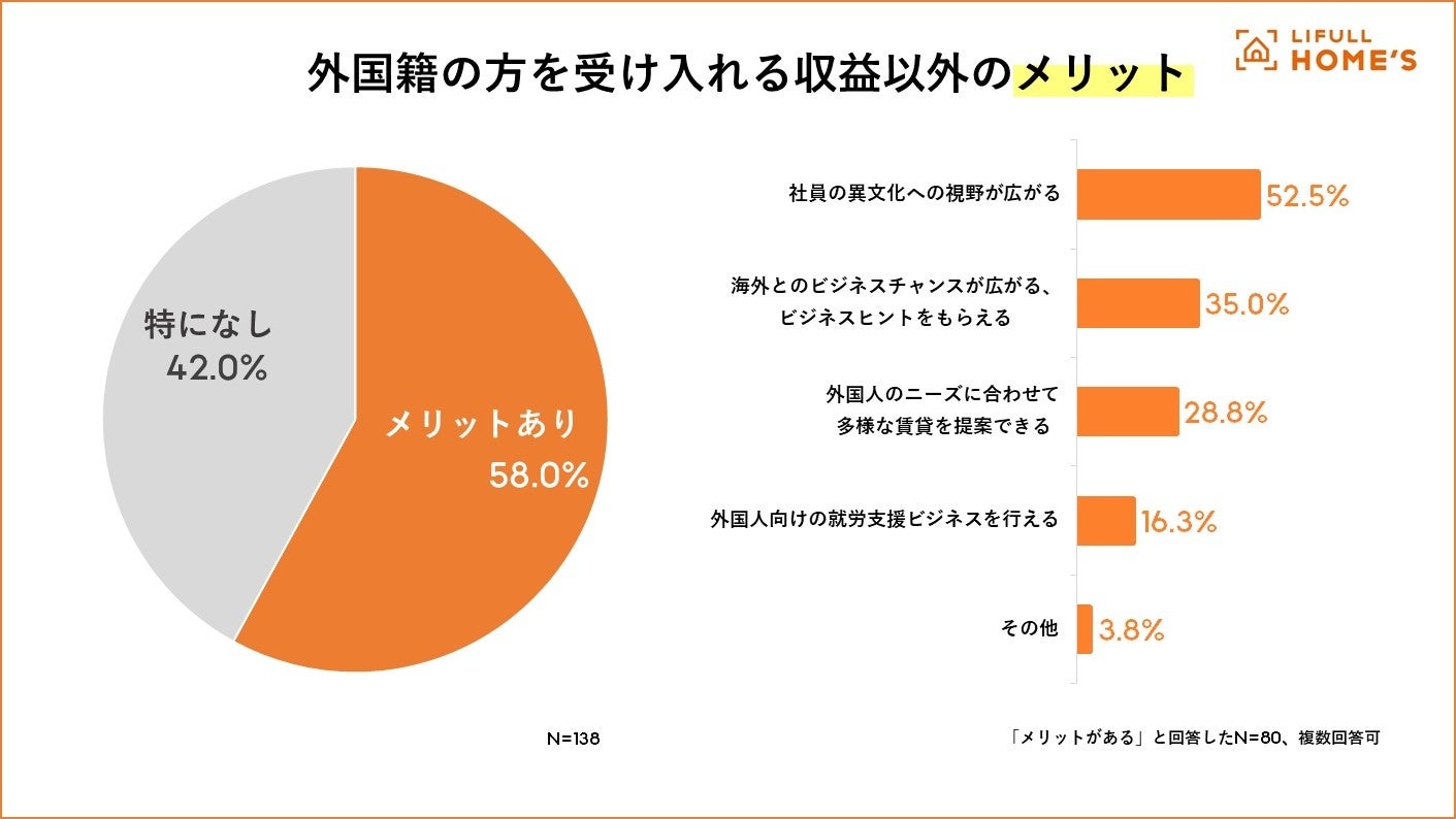 約6割の不動産店舗が収益以外のメリットが「ある」と回答しました。最も多かったのが「社員の異文化への視野が広がる」(52.5%)、続いて「海外とのビジネスチャンスが広がる、ビジネスヒントをもらえる」(35.0%)でした。また、約3割が「外国人のニーズに合わせて多様な賃貸を提案できる」と回答しており、日本では人気のない物件が文化の違いから外国籍の方には需要があるといったケースもあるようです。