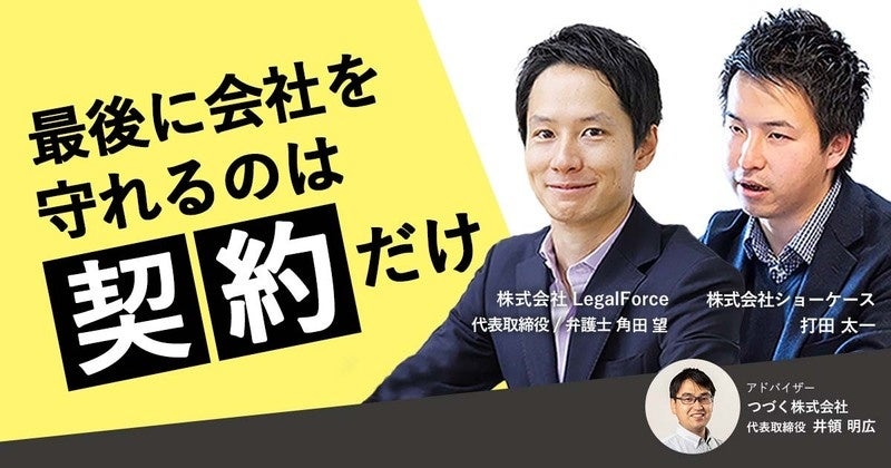 株式会社LegalForce 代表取締役/弁護士 角田望、株式会社ショーケース 打田太一、つづく株式会社 代表取締役 井領明広(アドバイザー)