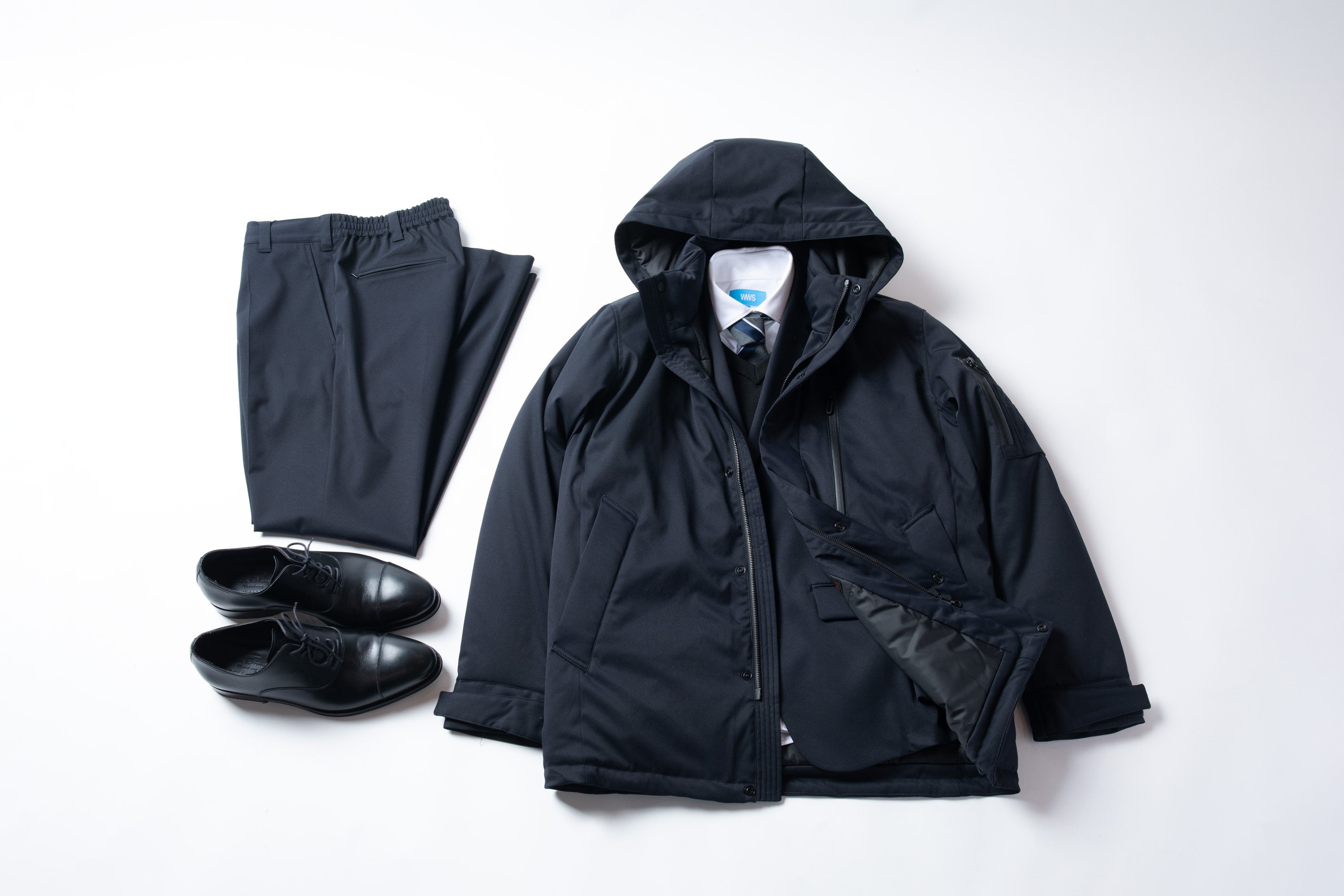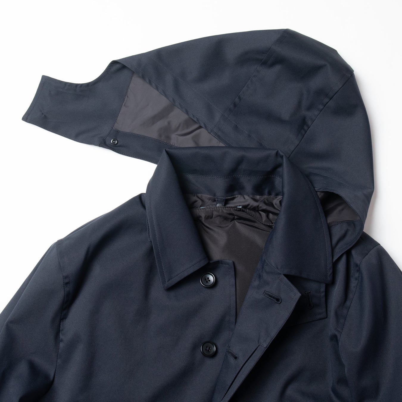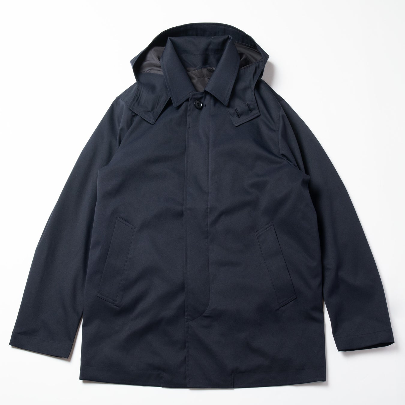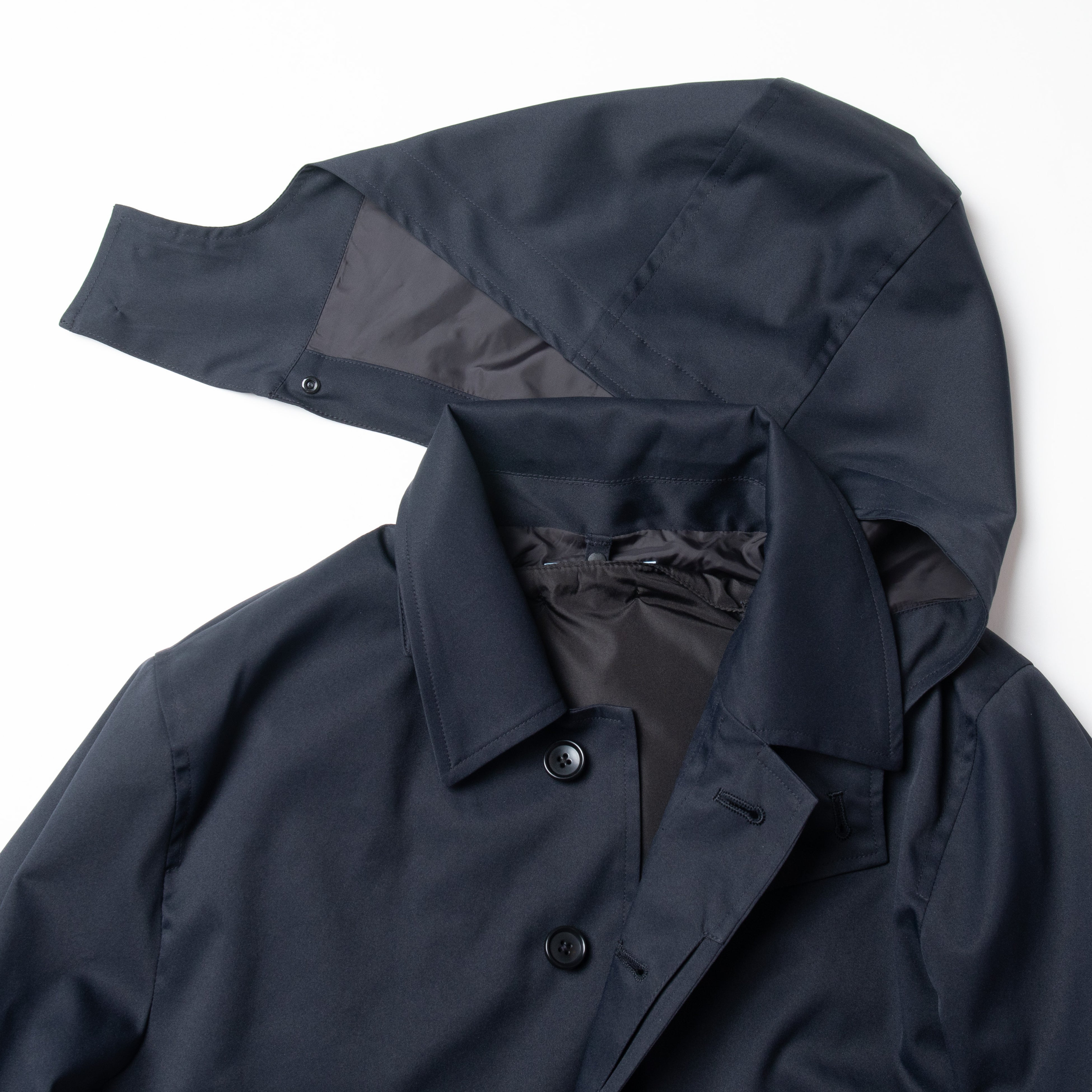 特徴:秋から春まで着用できるショート丈のアウター。スナップボタンで取り外し可能なベストは、スーツジャケットの下にインナーダウンとして着用でき、気温やスタイルに応じて着方を変えられます。フードは着脱可能。フード無ではステンカラーコートとして着用でき、フード有では顎下までボタンで留めることができるため、風よけに最適。生地には速乾・撥水・ストレッチ・防シワ・耐久性などの機能を備える自社オリジナル素材「ultimex」を使用。ベストの中綿は再生繊維を使用した環境にやさしい素材である「サーモライト®エコメイド中綿」を使用し、軽量かつ優れた保温性を実現しました。