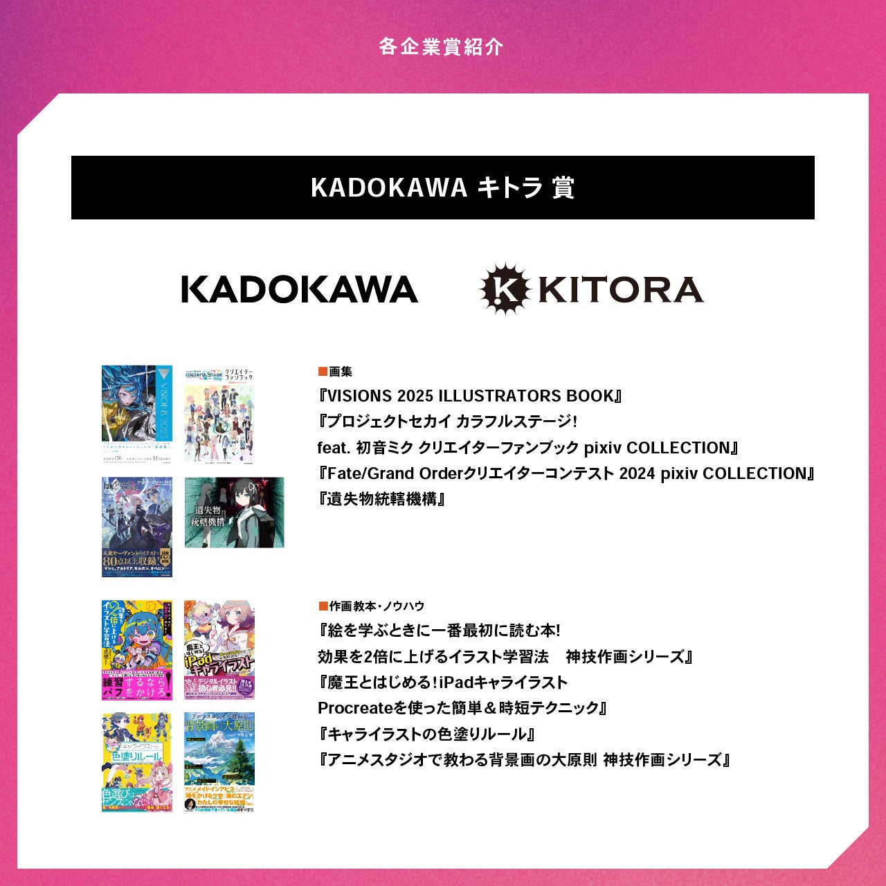 株式会社KADOKAWA キトラ編集部では、若い才能の"発掘"を目指し、おもにイラストやマンガジャンルにおきまして、新しいクリエイターの方々とその作品を日々探し続けております。「pixiv高校生イラコン2025」を通して、若い作家の方々の斬新で生き生きとした作品に出会えることを非常に楽しみにしています。