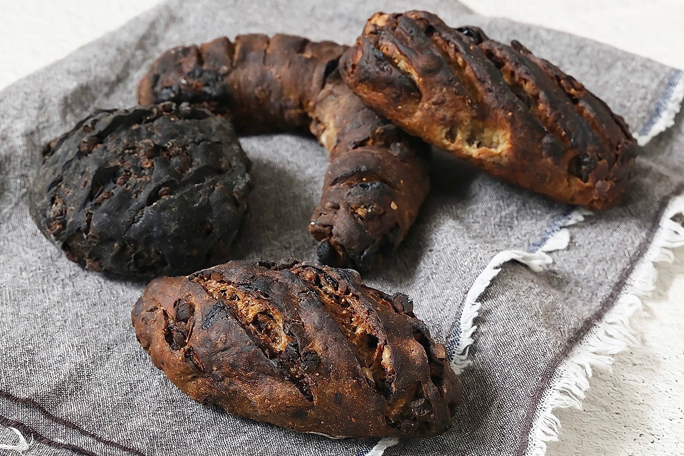 フランス産のゲランドの塩やイタリア産の中硬⽔を使⽤した⽣地に、カカオ70パーセントのチョコレートと⾚ワインに浸けたオーガニックの⽩イチジク、レーズン、クルミを合わせて焼き上げました。⽢さ控えめなハイカカオチョコレートと、⾚ワインに漬けたほんのりと⽢酸っぱいドライフルーツの相性を存分にお楽しみいただけます。