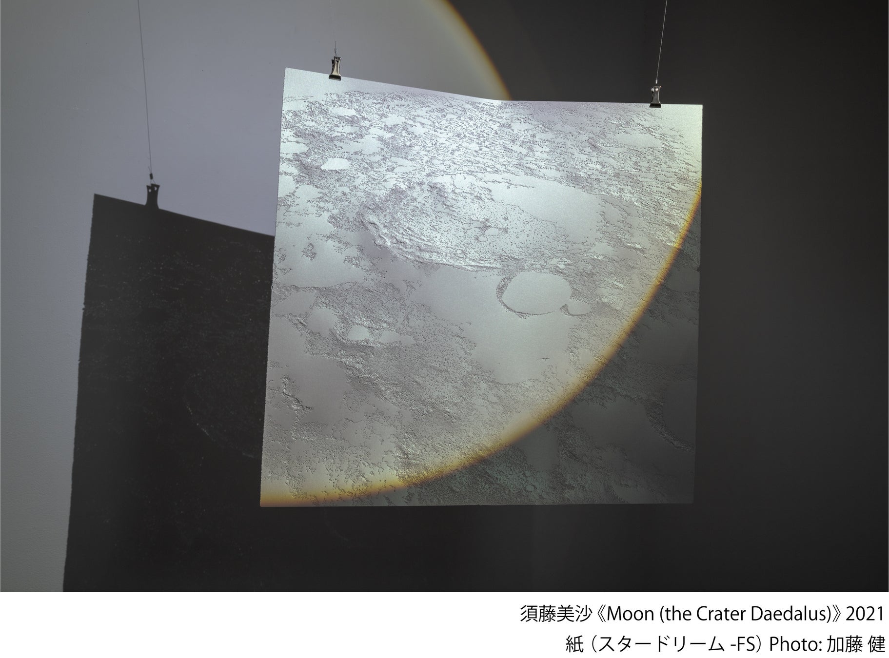 須藤は、天体観測や神話に深く関心を寄せ、宇宙の画像や天文に関する事物をモチーフに、体感し難い宇宙空間を表現し、宇宙との距離を縮めることを試みます。紙にピンで無数の穴をあけ、光をあてることで、画面上に星々や銀河、惑星などのイメージを浮かび上がらせる作品を主に制作しています。