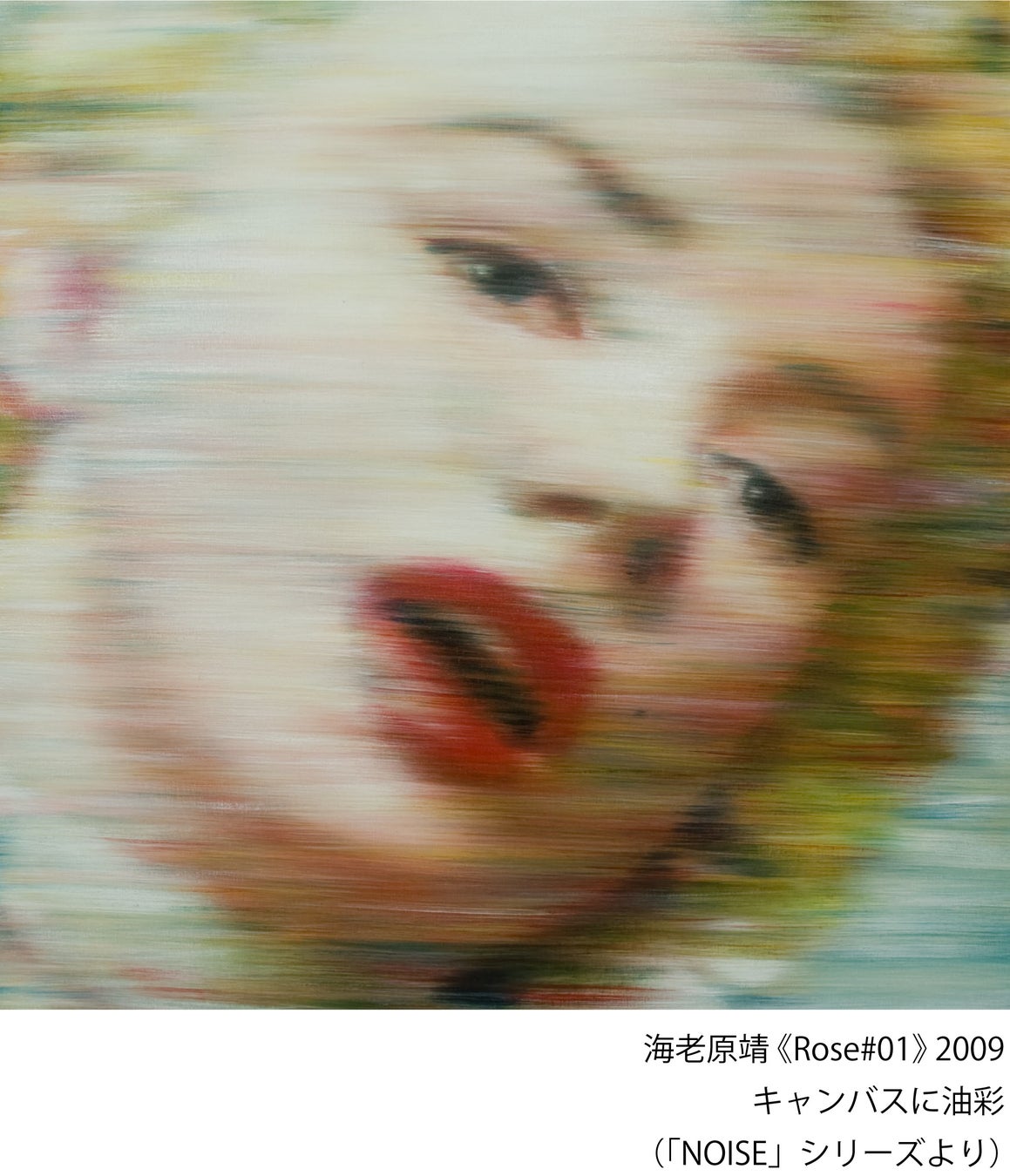 本展で発表する「NOISE」シリーズは、映画のビデオテープを一時停止した状態の一瞬を捉えた油彩作品です。断片の連続として流れる映像が時間を引き止められたかのように固定され、走査線によって乱れる画面は静止画でありながら、動きを感じさせます。そこに描かれた女優の顔や風景は、本来のストーリーとは切り離され、鑑賞者に異なるイメージを想起させるでしょう。映像の中に、認識されない瞬間があることを提示することによって、私たちが生活する中でも認知し、意識に残る記憶はごく一部であることを気づかせると共に、消えていく図像と増殖するイメージの混沌を往復させます。
