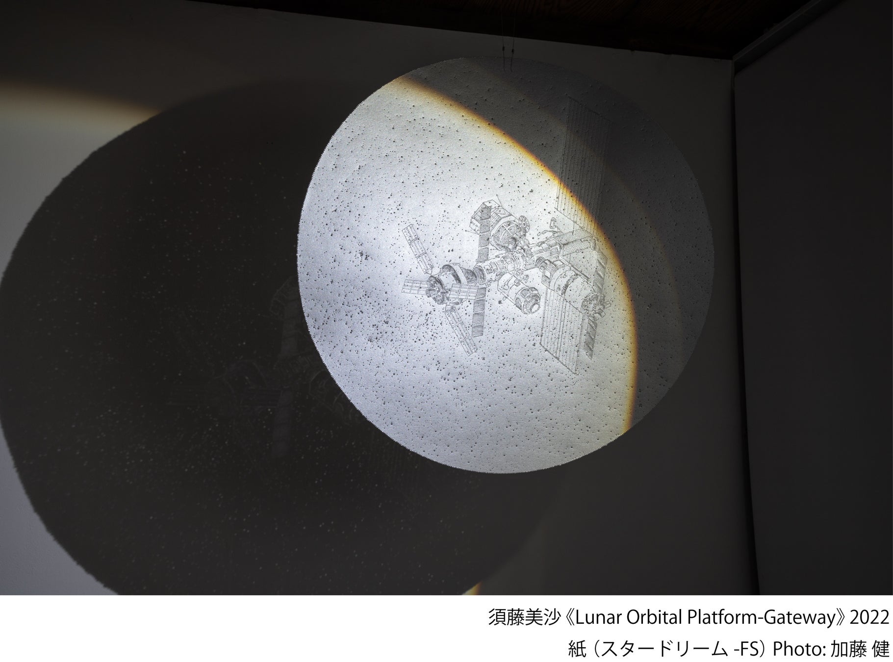 宇宙で起きている現象は、日常ではなかなか把握できないものですが、小刻みに手を動かし、描き出す須藤の宇宙からは、手触りや重力が感じられます。鋭利な道具を用いて紙を突き刺すことで生じた凹凸や裂け目に注目すると、宇宙の神秘的な印象とは裏腹に、荒々しい宇宙の険しさを想起させ、ある種の恐怖感を覚えます。本展では、太陽観測衛星「ひので」が捉えたX線画像をはじめ、研究者へのインタビューや集積したデータをもとに、太陽や土星、天の川などをモチーフとしたインスタレーションを発表します。個々の作品と向き合い、それぞれの星の微細な特徴を味わう空間を構築します。