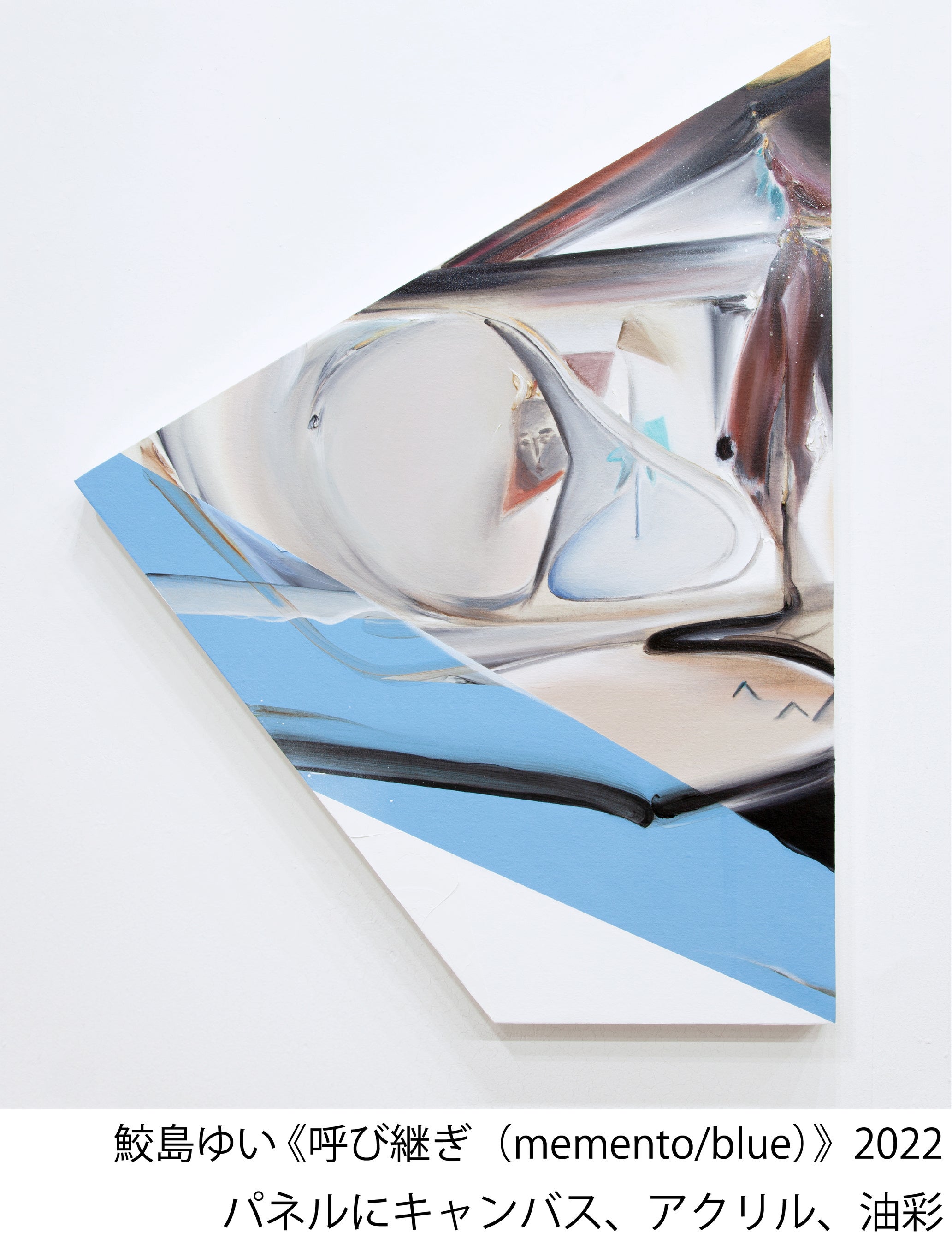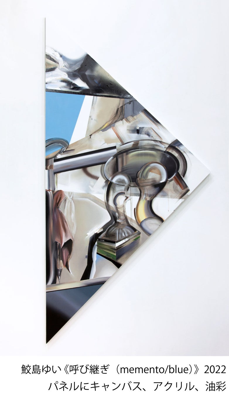 本展では、近年取り組む絵画シリーズ「呼び継ぎ」*を中心に、古代遺跡や使われなくなった誰かの道具、伝承、オカルトなどを題材として、多角的に空間を構成します。絵画制作に「呼び継ぎ」を取り入れ、作品の中でつなぎ合わされた異なる歴史や物語を持ったイメージの断片から、そこには描かれていない存在を手繰り寄せます。また、鮫島が多用する変形キャンバスは、何かの断片のようであり、組み合わせることでまた別の次元を出現させます。さらに、遺物や言説など、手に取ることができない対象を描く際、「依り代」と称する小さな立体物を制作します。こうした行為をとおして、そこに宿る精神を捕捉し、身体的な解釈から二次元へと再構成を試みます。